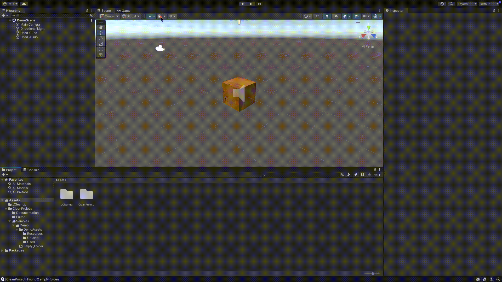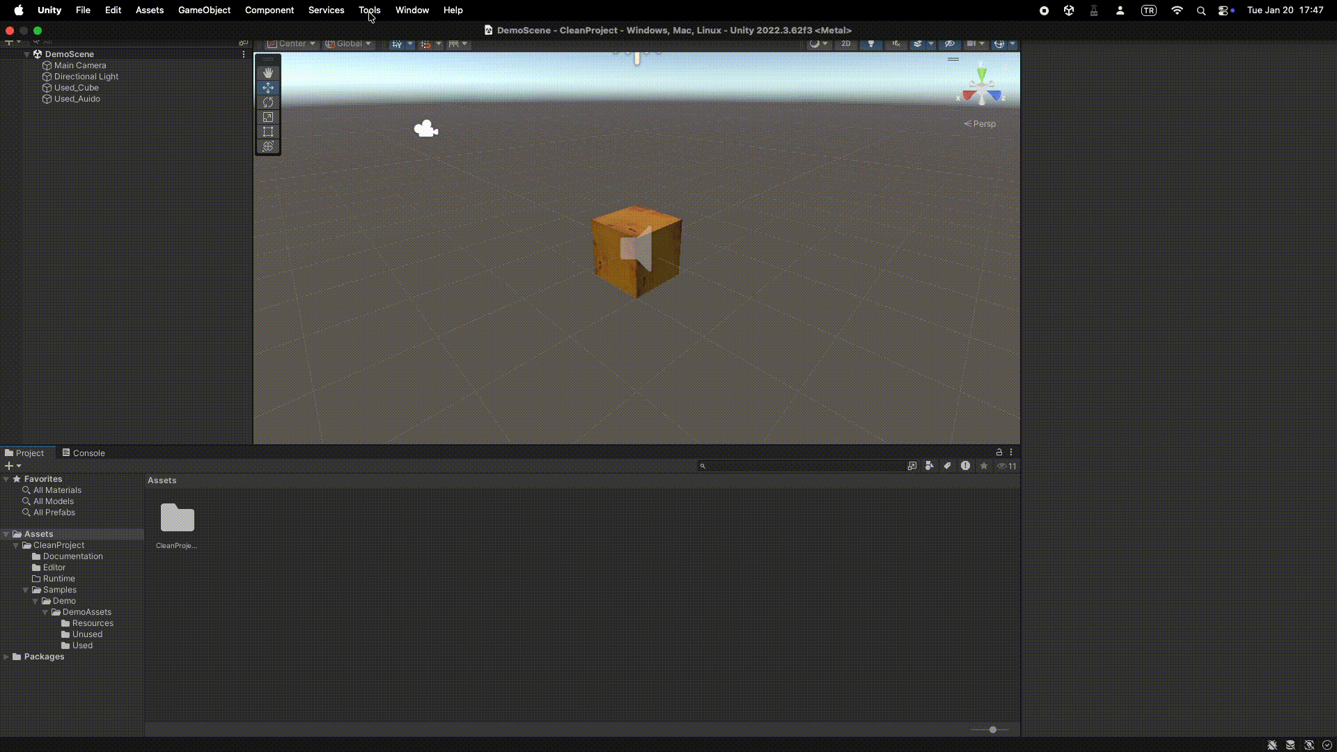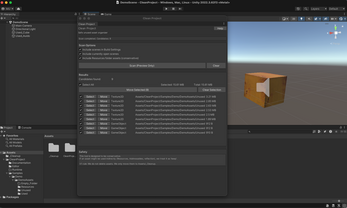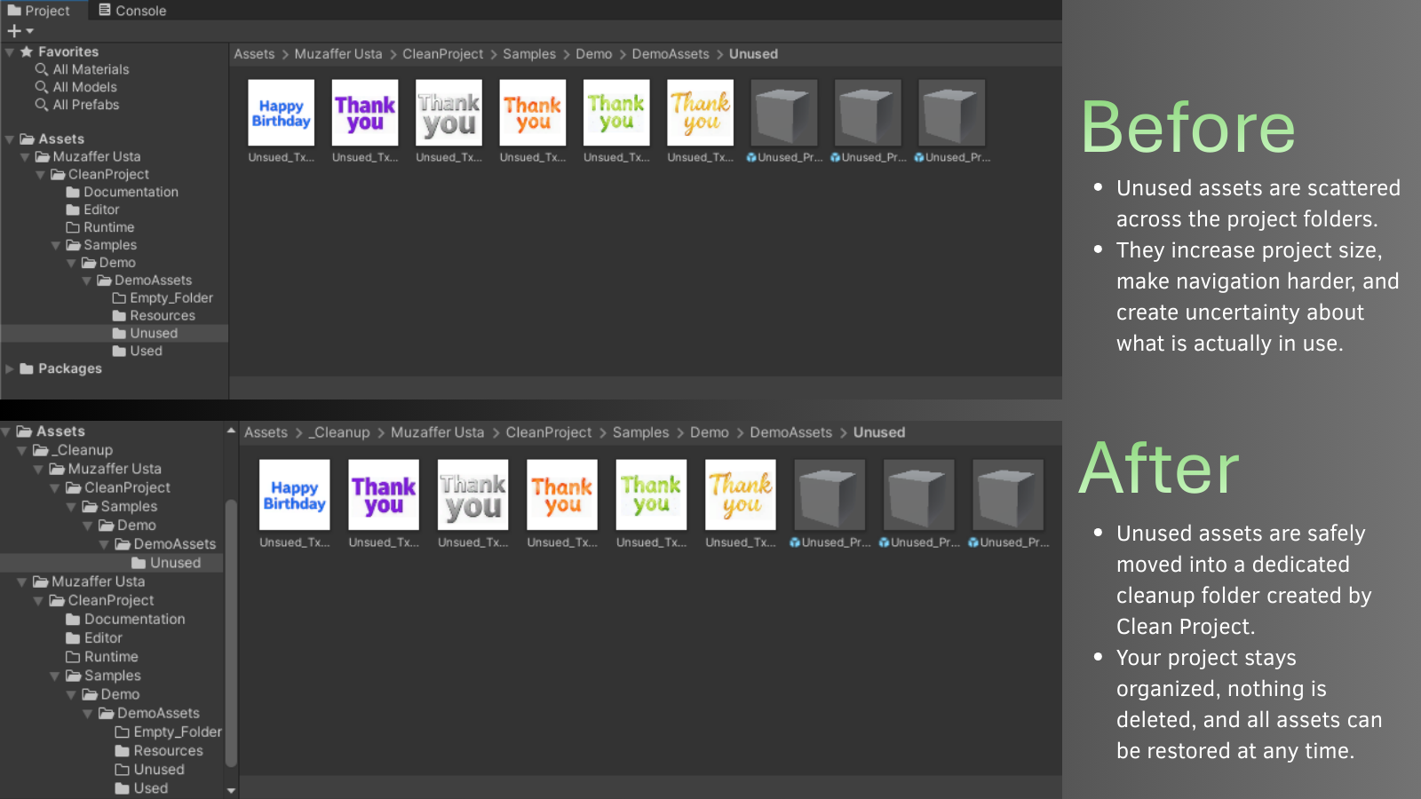 Clean Project works entirely inside the Unity Editor and requires no additional setup or dependencies.