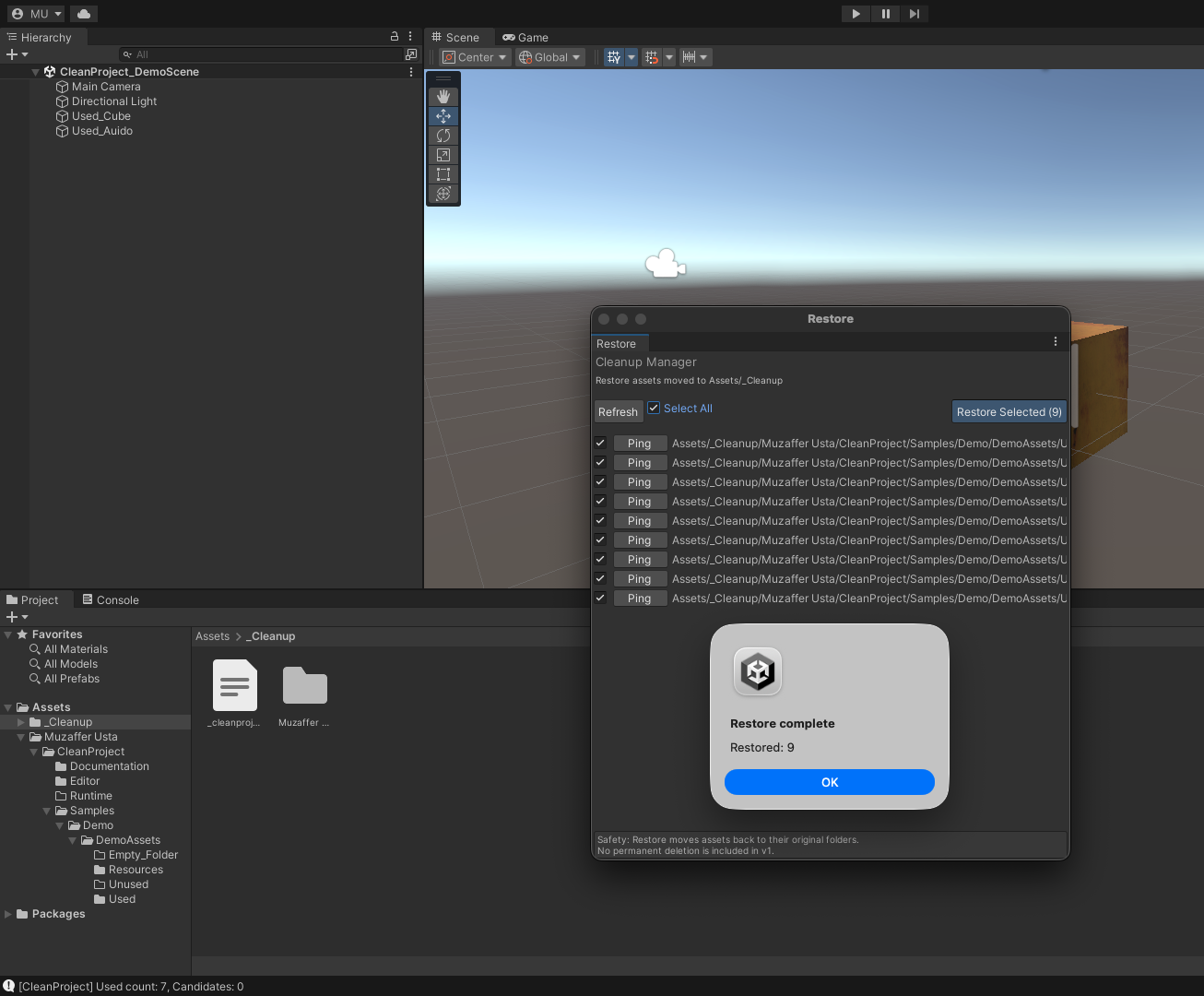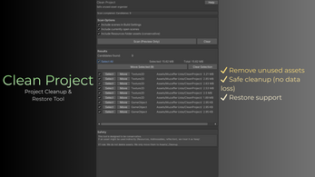 Clean Project is a Unity Editor utility designed to help developers maintain clean, organized, and efficient projects.