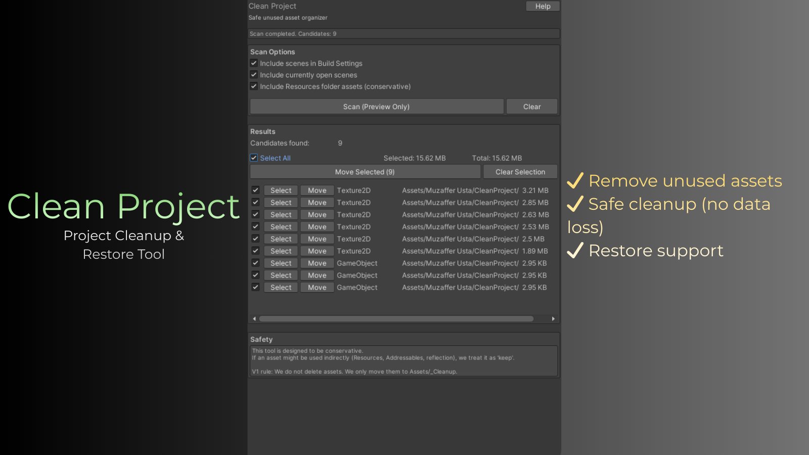 | Tags | asset-cleaner, asset-management, cleanup, developer-tools, editor-tools, editor-utilities, project-organization, Unity, unused-assets, workflow-tool |